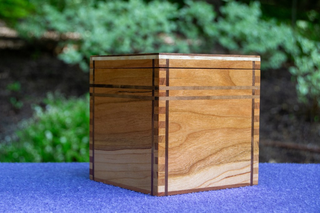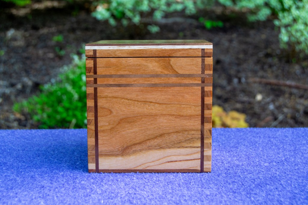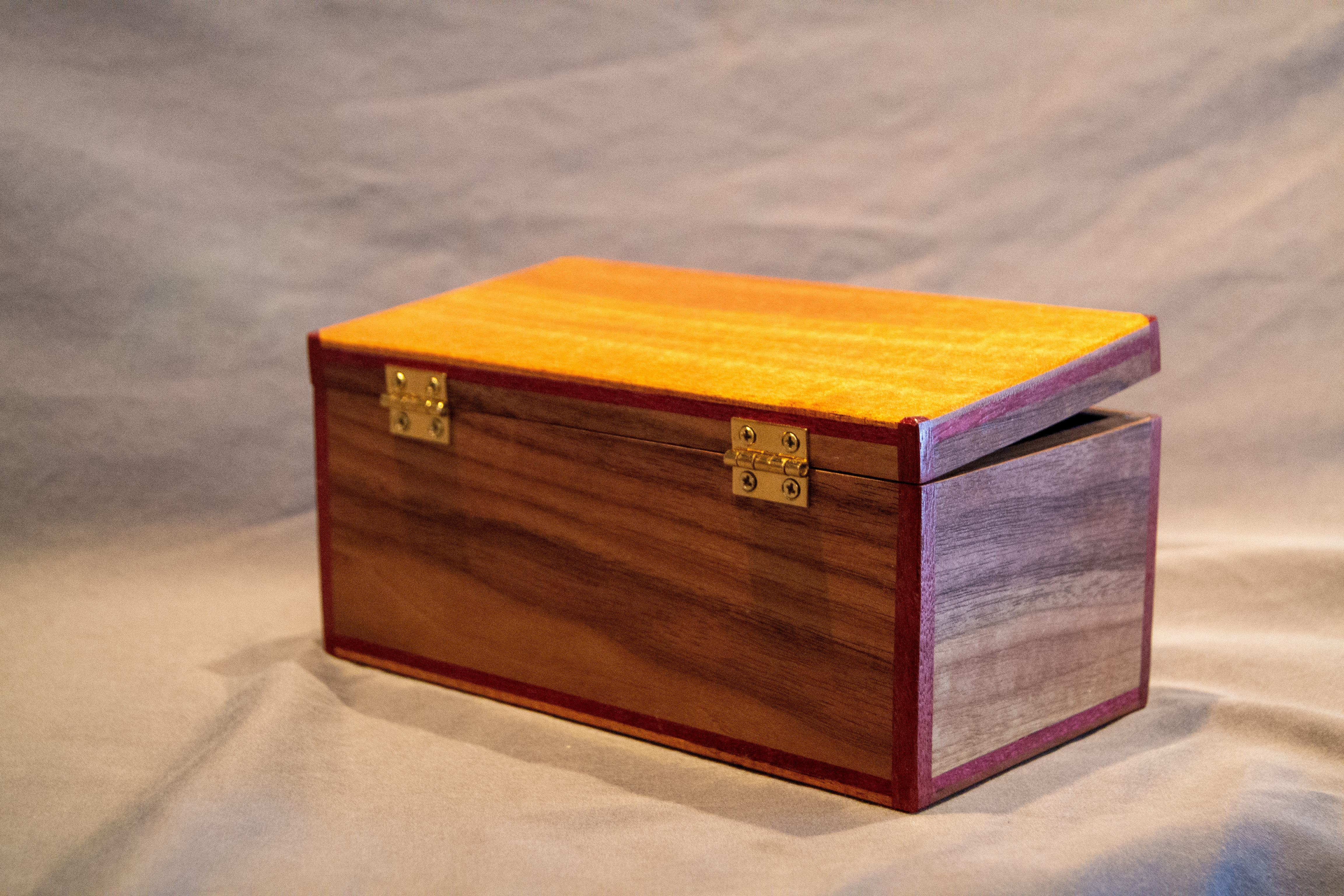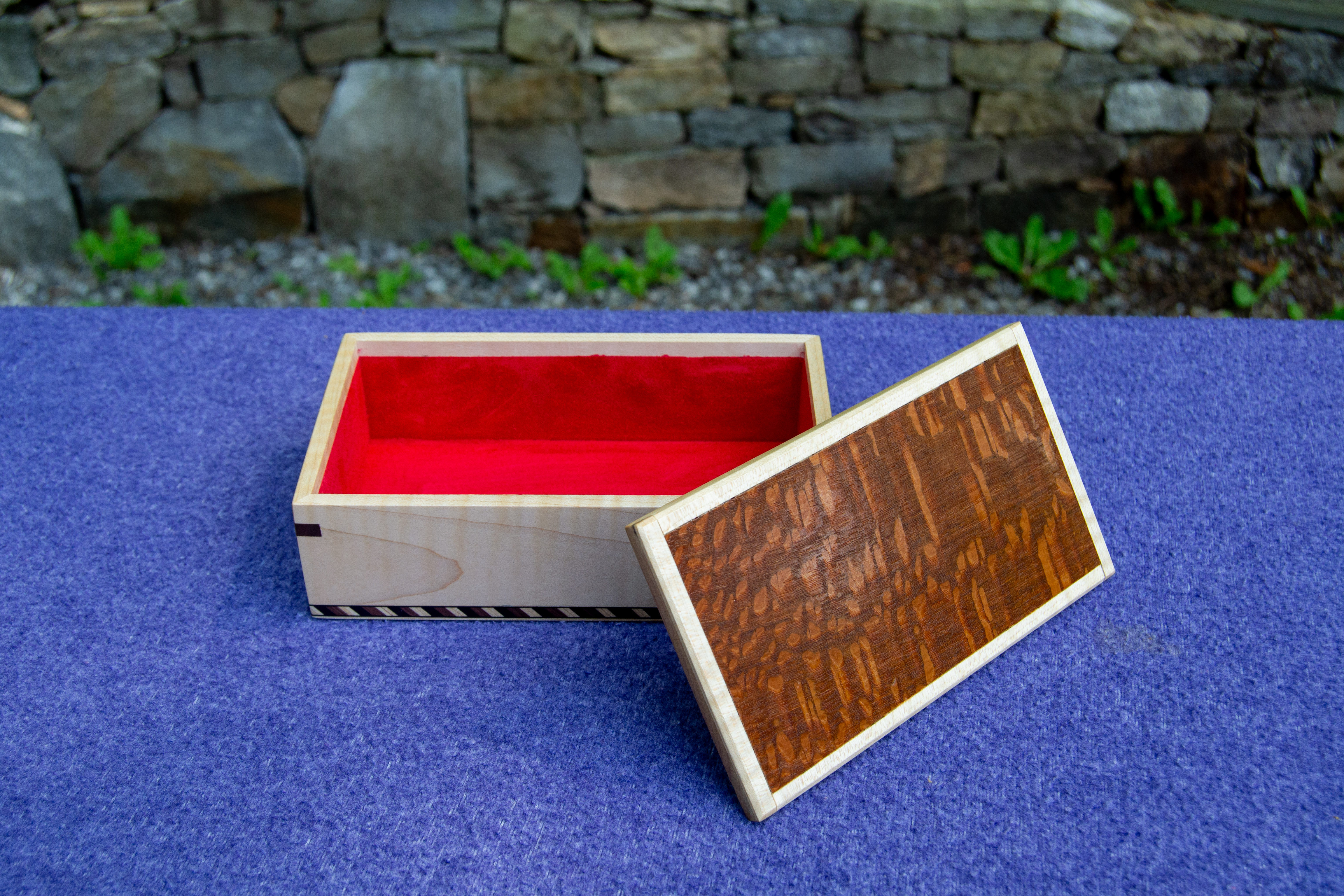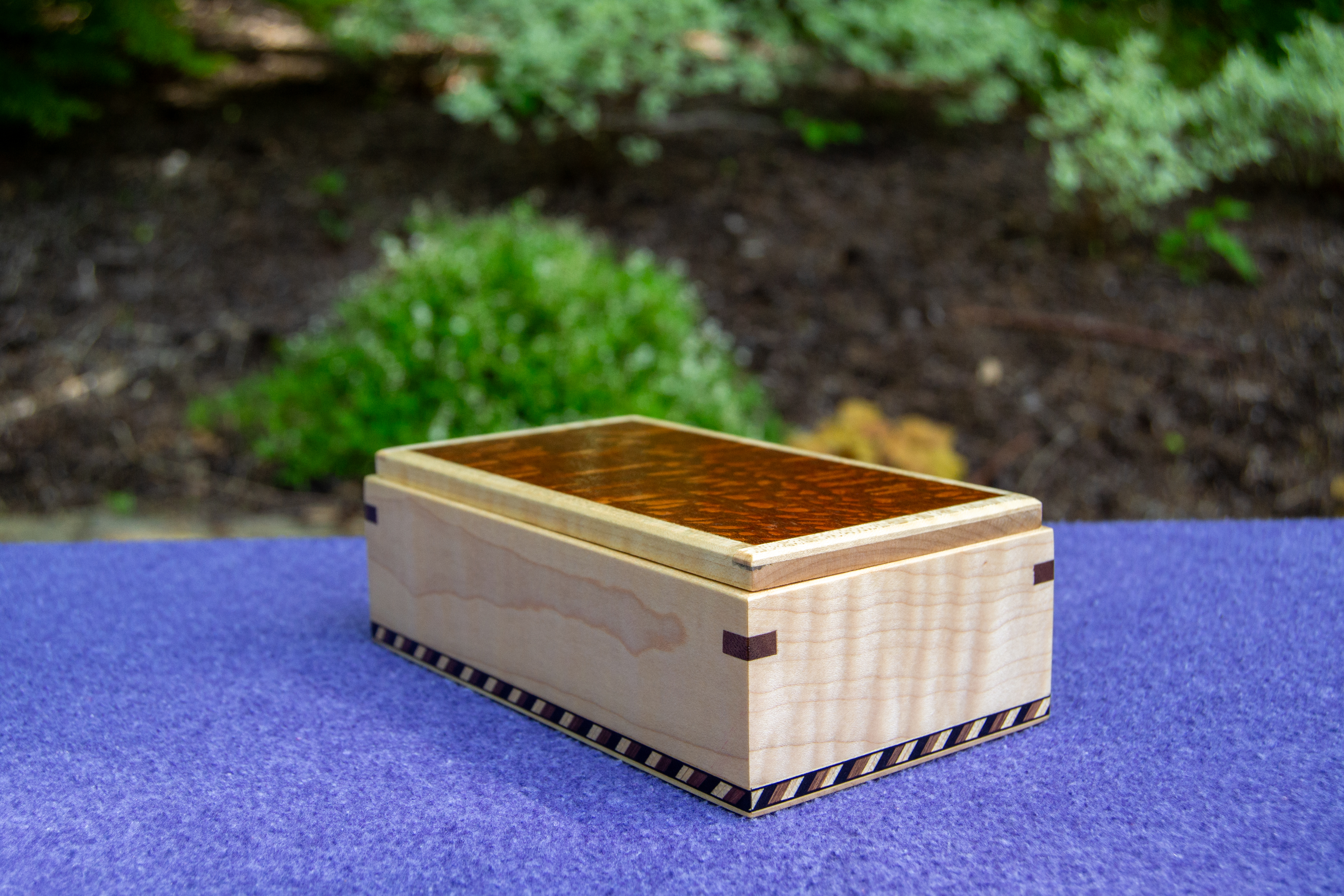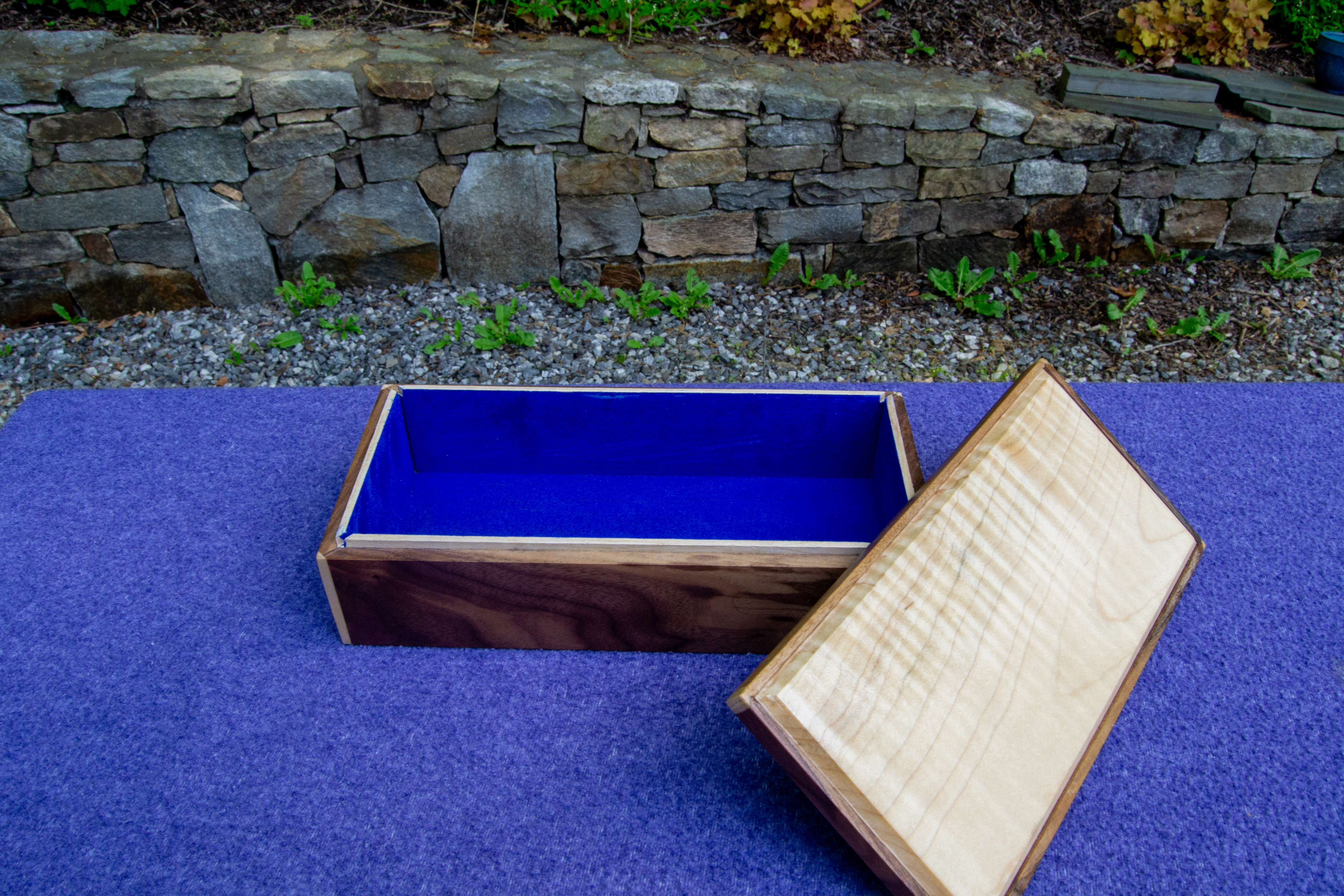 The walnut body provides a rich, organic feel, with flowing grain patterns that are perfectly grain-matched all the way around the box. The curly maple lid is a treasure in itself and adds a touch of brilliance as it catches light from different angles. Pictures cannot do it justice.