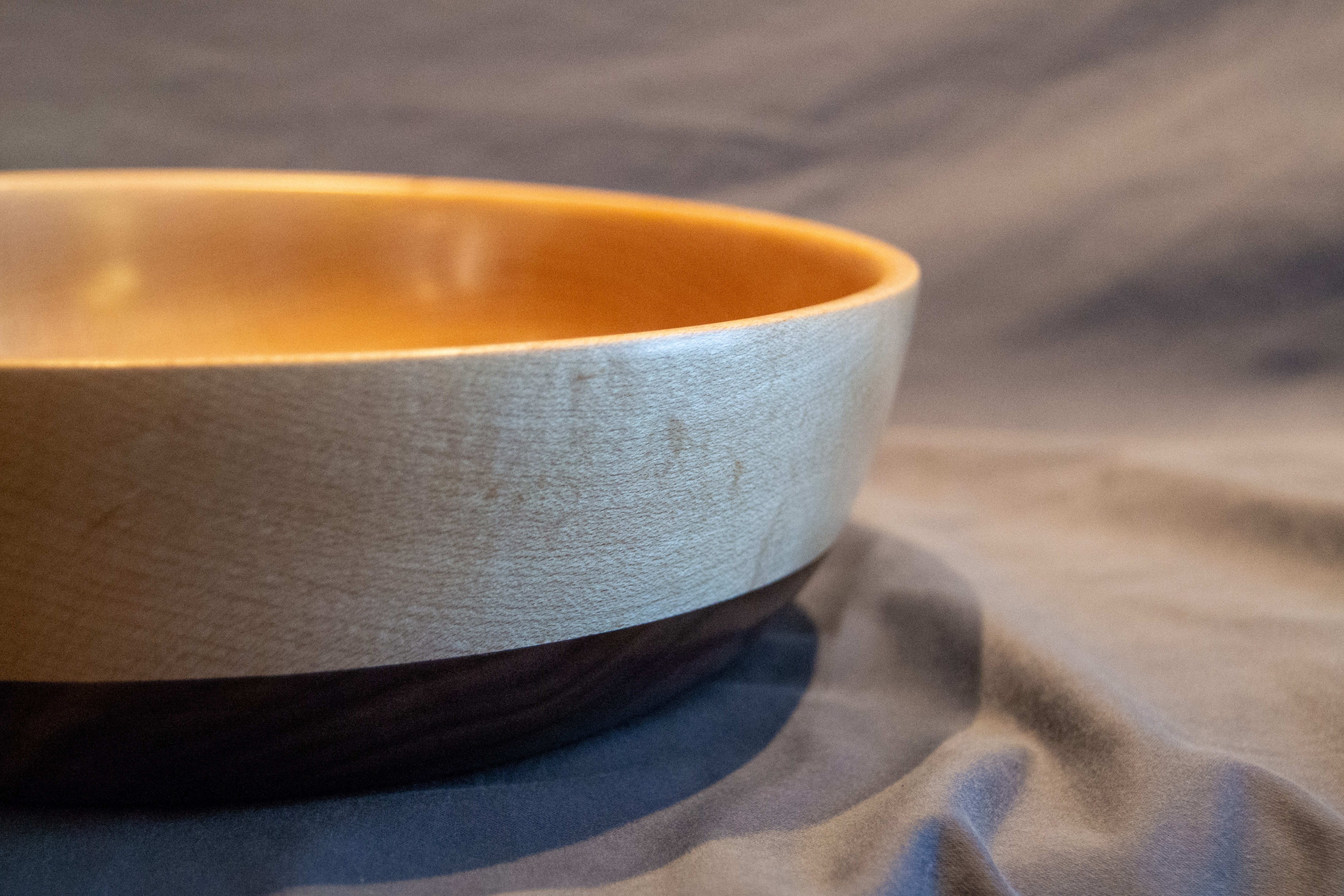 The seamless transition between these two hardwoods showcases both their distinct beauty and how they complement each other. The maple rim catches light beautifully, emphasizing its fine grain, while the walnut base anchors the piece with its rich, flowing patterns.