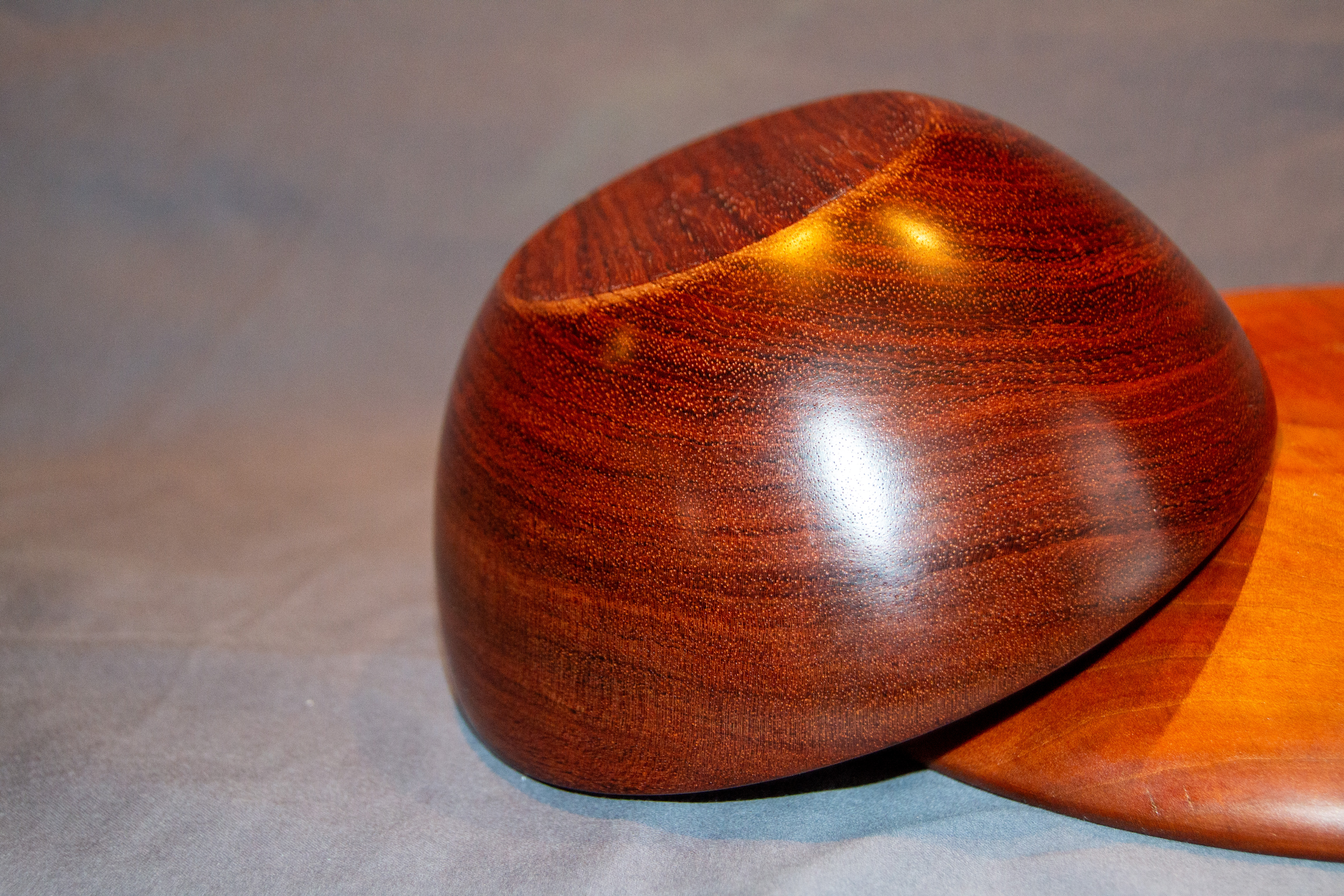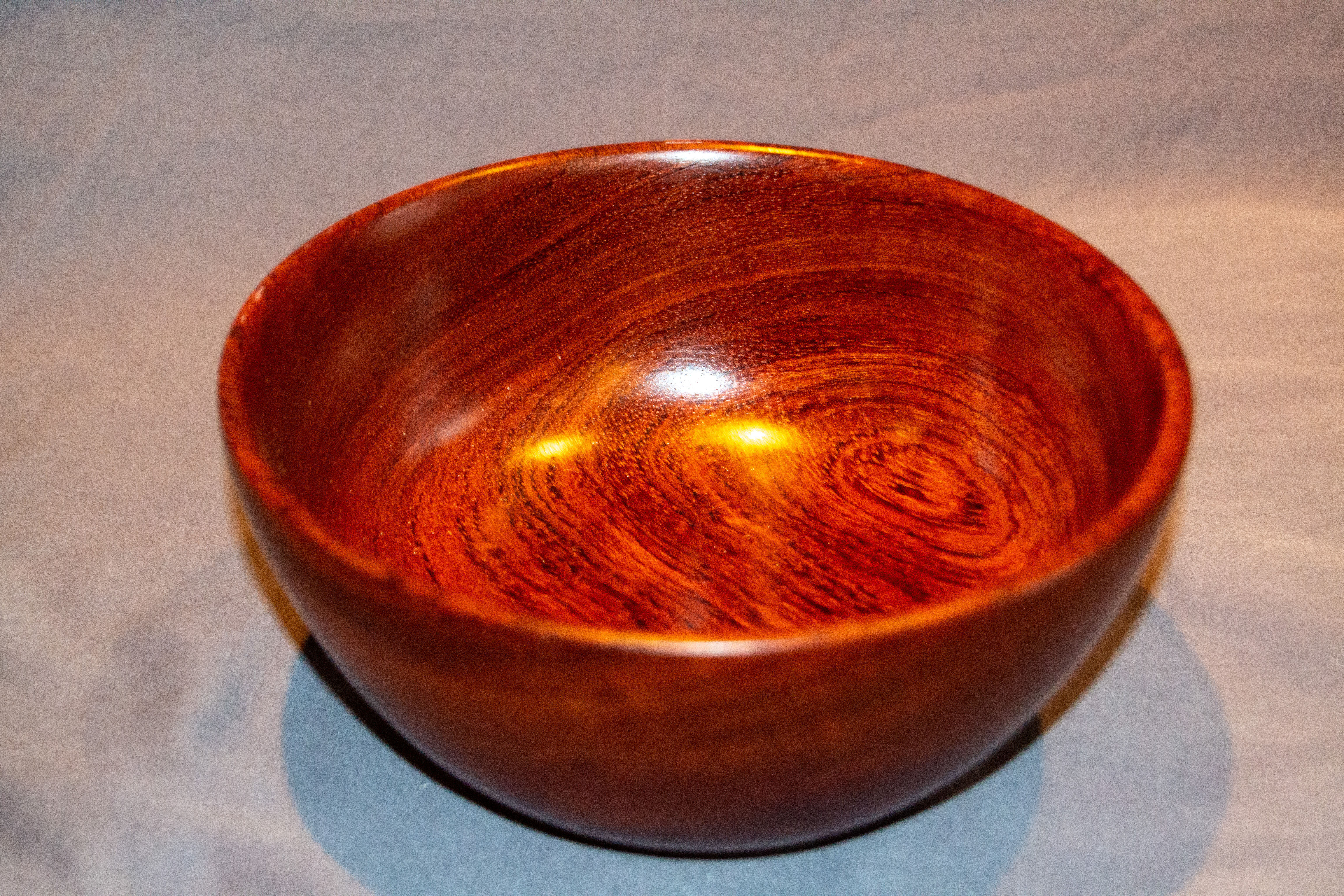 This hand-turned bowl showcases the rich, reddish-brown tones and fine-grained texture of bubinga, an exotic African hardwood prized for its striking color and density. The polished surface glows with a deep, almost glass-like luster, emphasizing the intricate grain movement and natural chatoyance that shifts under changing light.